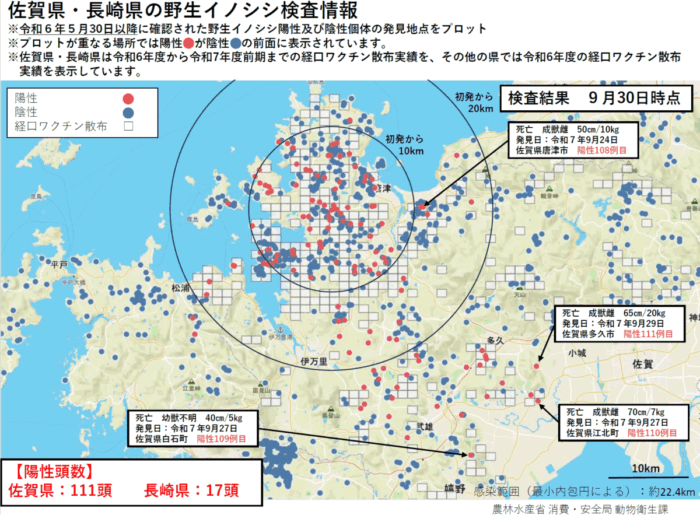 佐賀県では長年の捕獲強化策が功を奏し、元々個体数が減少傾向にあったところに、この疫病による淘汰が加わった結果、短期間で劇的な捕獲数の減少を引き起こしたと考えられます。