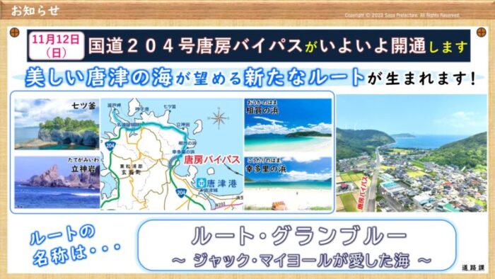 唐津市のサイクルツーリズム事業で、ルート・グランブルーの枝別れコースである「呼子発陣跡巡りコース」と「呼子発加部島コース」を唐津観光協会が公開している。