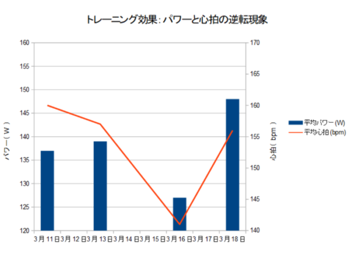 3/18は、パワー(148w)が心肺負荷(156bpm)を上回る「逆転」が起きた。 3/11時点では、137w出すのに160bpmを要していた。心拍を4bpm下げ、出力を11w上げた事実は、心肺の燃費向上を意味する。